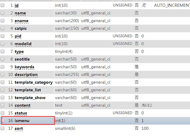 3,category表里增加“ismenu”字段,當然這個字段隨便寫,只要跟程序里調用的對應就行