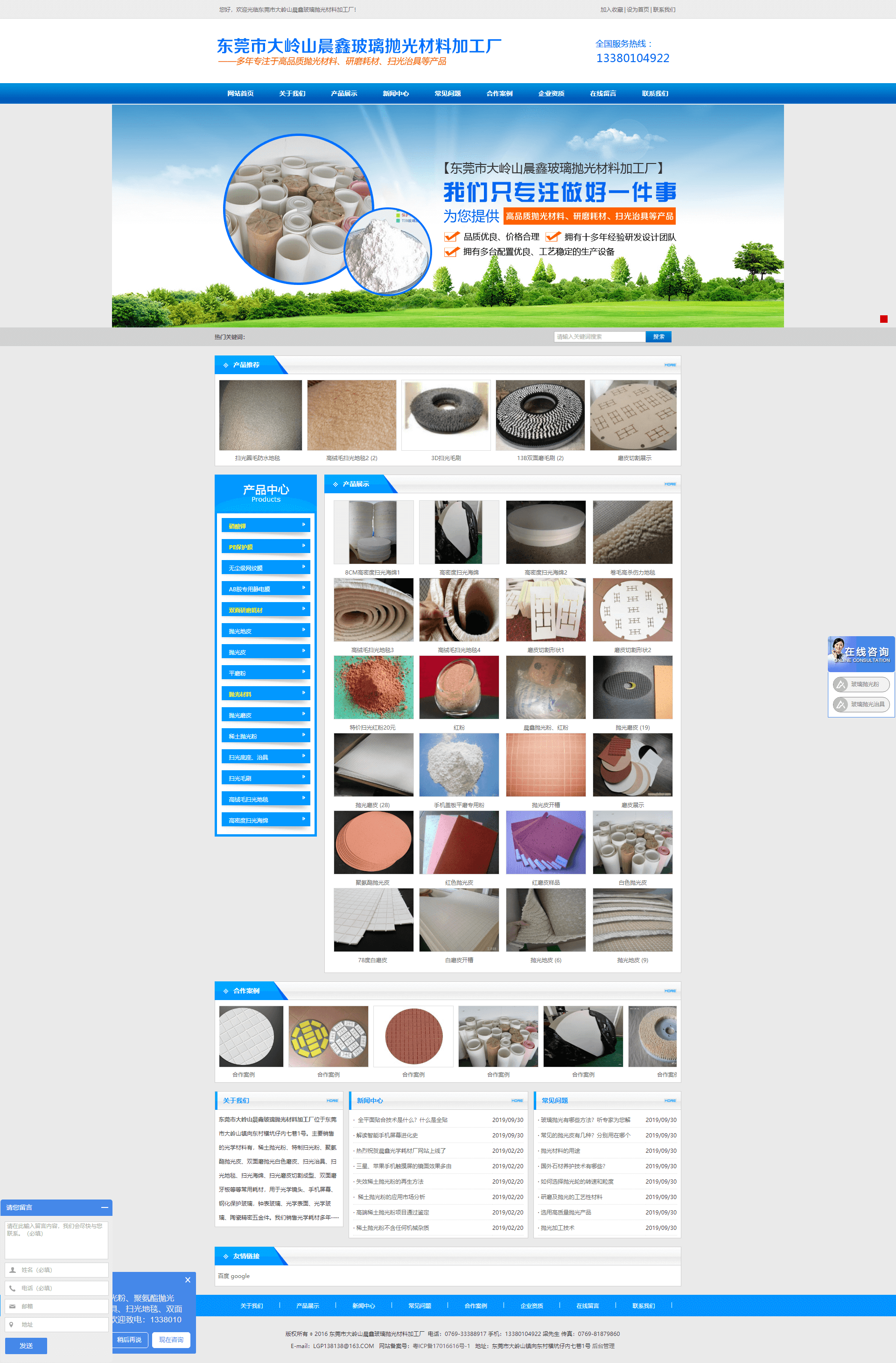東莞市大嶺山晨鑫玻璃拋光材料加工廠位于東莞市大嶺山鎮(zhèn)向東村橫坑仔內(nèi)七巷1號(hào)。主要銷(xiāo)售的光學(xué)材料有,稀土拋光粉、特制掃光粉、聚氨酯拋光皮、雙面磨拋光白色磨皮、掃光治具、掃光地毯、掃光海綿、掃光磨皮切割成型、雙面磨牙板等等常用耗材,用于光學(xué)鏡頭、手機(jī)屏幕、鋼化保護(hù)玻璃,鐘表玻璃、光學(xué)表面、光學(xué)玻璃、陶瓷精密五金件。我們銷(xiāo)售光學(xué)耗材多年······